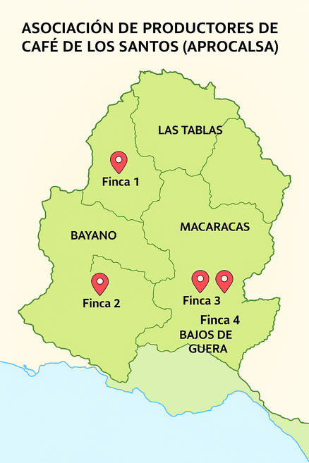 Las fincas seleccionadas pertenecen a la Asociación de Productores de Café de Los Santos (APROCALSA). En el distrito de Las Tablas se ubicaron las fincas 1 y 2 en el corregimiento de Bayano, georreferenciadas mediante GPS: