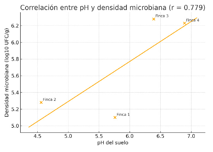 Los resultados evidenciaron una correlación positiva (r = 0.778) entre el pH del suelo y la densidad microbiana expresada en log₁₀ (UFC/g). Los suelos menos ácidos (pH 6.3–6.9) presentaron un mayor número de microorganismos cultivables, mientras que los más ácidos (pH 4.5–5.0) mostraron una reducción significativa de la biomasa microbiana activa (Figura 2).