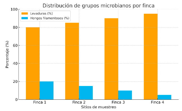 El análisis de los grupos funcionales reveló que las levaduras representaron el componente dominante de la microbiota en todas las fincas (80–95%), seguidas por los hongos filamentosos (5–20%) (Figura 3). Este patrón sugiere un papel importante de las levaduras en el metabolismo del suelo y su posible participación como microorganismos promotores del crecimiento vegetal.