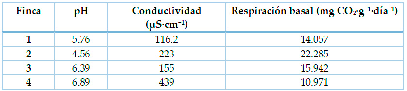 Los valores medios de pH y conductividad mostraron variaciones entre fincas (Tabla 1), con suelos predominantemente ácidos (pH < 7). El pH osciló entre 4.56 y 6.89, mientras que la conductividad eléctrica se mantuvo entre 116.2 y 439 µS·cm⁻¹. La respiración basal, indicador de actividad microbiana, varió de 10.97 a 22.29 mg CO₂·g⁻¹·día⁻¹, con la mayor tasa observada en la Finca 2.