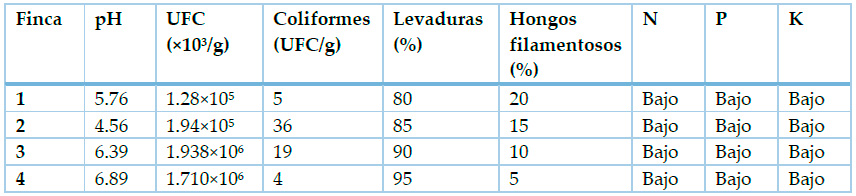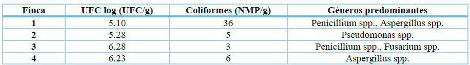 Los recuentos microbianos variaron entre fincas, con valores de 5.10 a 6.28 log UFC/g (Tabla 2). Se detectó la presencia de coliformes en todas las muestras, aunque en bajas concentraciones (3–36 NMP/g). Los géneros predominantes identificados fueron Penicillium, Aspergillus, Pseudomonas y Fusarium, todos asociados a procesos de solubilización de nutrientes y biocontrol.
