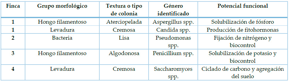 La caracterización morfológica de los aislamientos evidenció la presencia de diversos morfotipos, predominantemente hongos filamentosos de textura aterciopelada o algodonosa, levaduras de textura cremosa y bacterias con colonias lisas (Tabla 4). Los análisis preliminares indican un potencial funcional relevante, destacándose Aspergillus spp. y Penicillium spp. como solubilizadores de fósforo y potasio, Pseudomonas spp. como fijadora de nitrógeno y agente de biocontrol, y Saccharomyces spp. por su contribución al ciclado del carbono y la agregación del suelo.