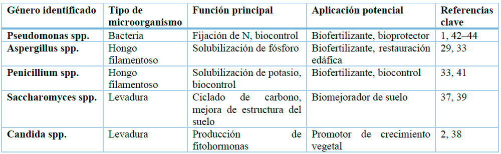 Además, con base en la identificación preliminar y la revisión bibliográfica reciente, se estableció el potencial biotecnológico de los principales géneros aislados (Tabla 5). Los resultados confirman la presencia de microorganismos nativos con funciones agronómicas clave, como la solubilización de fósforo y potasio (Aspergillus, Penicillium), la fijación de nitrógeno y el biocontrol (Pseudomonas), y la producción de fitohormonas y el mejoramiento de la estructura del suelo (Candida, Saccharomyces). Estos hallazgos sustentan la posibilidad de formular bioinoculantes autóctonos adaptados a las condiciones edáficas locales para mejorar la productividad y la sostenibilidad del cultivo.
