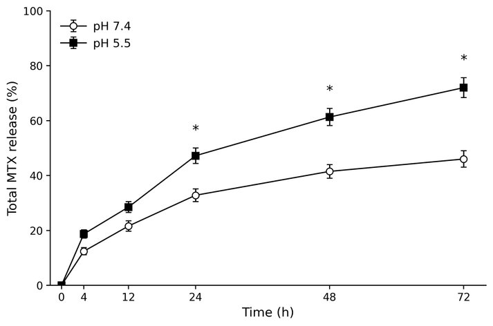 macrophages, while an acidic pH triggers methotrexate release, resulting in
