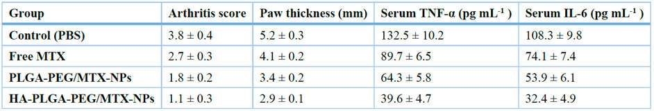 lower clinical arthritis grade, compared with free MTX. HA-PLGA-PEG/MTX NPs exhibited