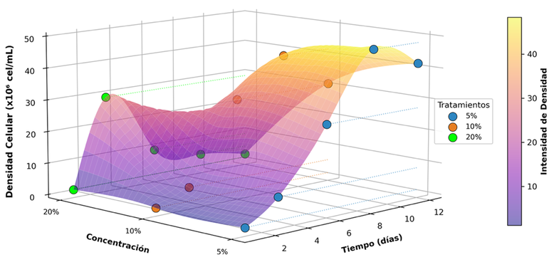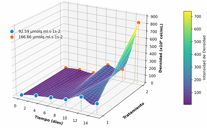 Estudios previos han señalado que en cultivos mixotróficos la concentración del sustrato orgánico debe mantenerse dentro de un rango óptimo, ya que niveles elevados pueden generar inhibición por sobrecarga metabólica o alteraciones en el equilibrio osmótico 25,26. La ausencia de incrementos proporcionales a mayores concentraciones observada en este estudio sigue esa tendencia, lo que indica que el beneficio del sistema mixotrófico depende de un ajuste fino entre aporte orgánico y capacidad metabólica celular 27.