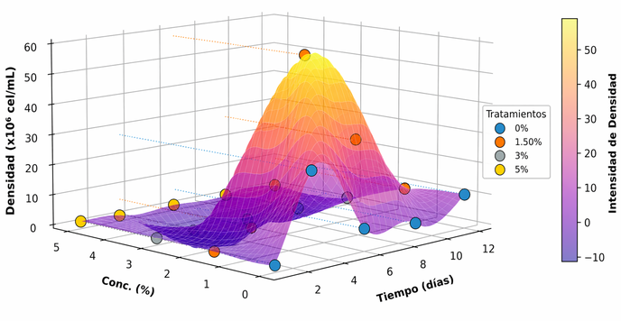 En microalgas verdes se ha reportado que el exceso de nutrientes puede alterar la relación N:P y modificar la eficiencia metabólica, afectando la cinética de crecimiento 14. Resultados similares en especies del género Chlorella muestran que concentraciones moderadas de fertilización promueven mayor productividad en comparación con niveles extremos, donde se observan limitaciones fisiológicas o acumulación de compuestos no estructurales 15.