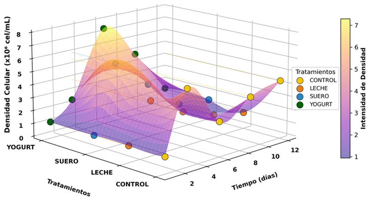La tabla 7 muestra que en el análisis de varianza hay diferencias significativas en la densidad celular entre los derivados lácteos evaluados (p < 0.05); la prueba de Duncan mostró que el yogurt natural semidescremado promovió el mayor crecimiento en comparación con suero y leche, las curvas de crecimiento indicaron que el cultivo con yogurt presentó una fase exponencial más prolongada y una mayor densidad celular final (Figura 6). El tratamiento con suero mostró crecimiento intermedio, mientras que la leche registró los valores más bajos de densidad celular.