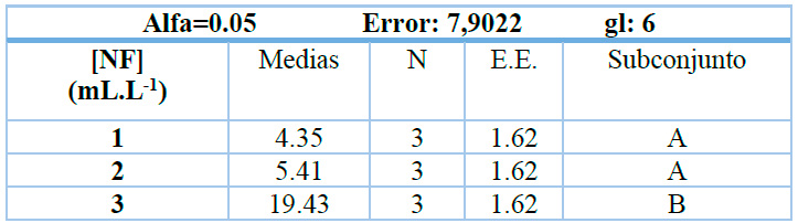 Como se muestra en la Tabla 1 el análisis de varianza aplicado a los valores de densidad celular mostró diferencias significativas entre tratamientos (p = 0.0010), la prueba de Duncan evidenció que la concentración de 3 mL·L-1 de fertilizante Nitrofoska promovió el mayor crecimiento celular en comparación con 1 y 2 mL·L-1. La densidad celular máxima alcanzó 26 × 106 cel·mL-1 a 3 mL·L-1; las curvas de crecimiento mostraron el inicio de la fase exponencial a partir del día 3 en todos los tratamientos (Figura 3), los valores máximos de densidad celular para 1 y 2 mL·L-1 se registraron al día 9; mientras que el tratamiento de 3 mL·L-1 alcanzó su máximo al día 12.