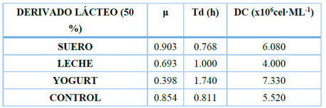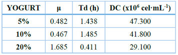 Tabla 10. Velocidades de crecimiento (μ), tiempos de duplicación (Td) y densidad celular máxima (DC) en función del derivado lácteo yogurt a diferentes concentraciones (5%,10 % y 20 %).