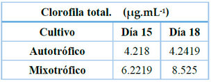 El contenido de clorofila total no presentó diferencias estadísticamente significativas entre tratamientos al día 15 (p = 0.6463), por lo que no puede afirmarse que ningún sistema produjo mayor acumulación de pigmentos en esa fecha.