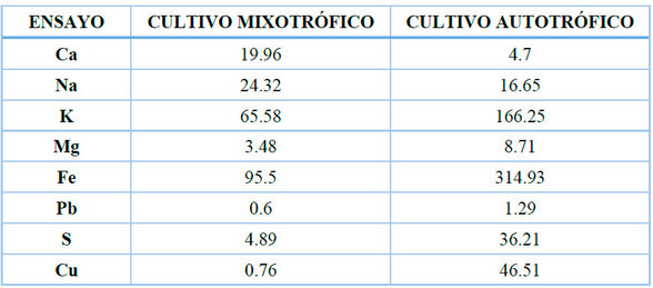 Tabla 14. Contenido de metales y de azufre (%) en la biomasa de Chlorella sp. en cultivos mixotróficos y autotróficos.