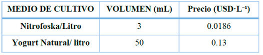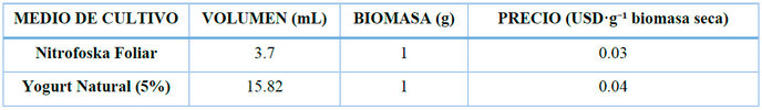 Tabla 16. Costos para producir 1g (gramo) de biomasa seca con cultivo autotrófico (Fertilizante Foliar Nitrofoska) y cultivo mixotrófico (yogurt natural semidescremado).