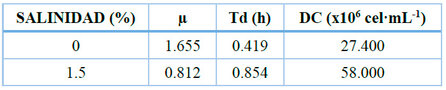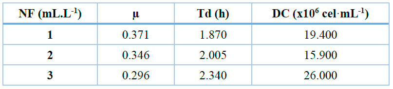 Tabla 2. Velocidades de crecimiento (μ), tiempos de duplicación (Td) y densidad celular máxima (DC) en función de la concentración de Nitrofoska (1, 2, 3 mL·L-1).