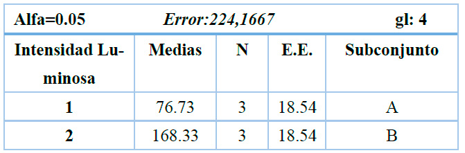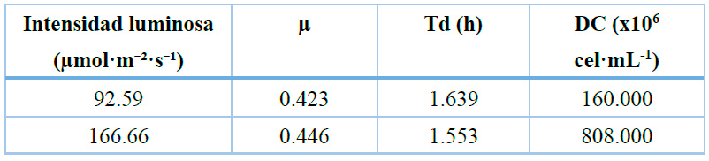 En la Tabla 3 se presentan los resultados del análisis estadístico, que evidenció diferencias significativas entre las intensidades luminosas evaluadas (p = 0.0250). La intensidad de 166.66 µmol·m-2·s-1 fue seleccionada como condición óptima tomando como variable principal la densidad celular final, por ser el indicador del rendimiento total de biomasa; bajo este criterio, esta intensidad favoreció el crecimiento microalgal en comparación con 92.59 µmol·m-2·s-1; las curvas de crecimiento mostraron el inicio de la fase exponencial desde el día 3 para ambos tratamientos (Figura 4). La mayor intensidad luminosa permitió alcanzar una densidad celular máxima de 808 × 10⁶ cel·mL-1 con un tiempo de duplicación de 1.553 h, mientras que la menor intensidad alcanzó 160 × 10⁶ cel·mL-1 y un Td de 1.639 h (Tabla 4); en este ensayo, la mayor densidad celular final coincidió con la mejor cinética de crecimiento, lo que refuerza la selección de 166.66 µmol·m-2·s-1 como condición óptima. El crecimiento obtenido a mayor intensidad luminosa superó aproximadamente 5.05 veces al registrado bajo menor iluminación, los máximos de crecimiento se alcanzaron al día 15 y día 12; respectivamente.