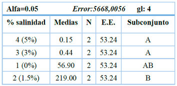 El análisis de varianza indicó que las diferencias entre tratamientos no fueron estadísticamente significativas (p = 0.1161); por lo tanto, no puede afirmarse que ningún tratamiento sea superior a otro con base en este análisis. No obstante, de manera descriptiva, la prueba de Duncan mostró que la salinidad de 1.5 % tendió a presentar valores de densidad celular mayores que los demás tratamientos evaluados (Tabla 5).