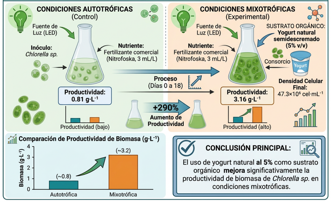 Resumen gráfico del estudio. Comparación esquemática entre el cultivo autotrófico (control) y el cultivo mixotrófico (experimental) de Chlorella sp. utilizando fertilizante comercial Nitrofoska (3 mL·L⁻¹) y yogurt natural semidescremado al 5 % (v/v) como sustrato orgánico. En condiciones mixotróficas se observó una mayor densidad celular final y una productividad de biomasa seca superior a la del sistema autotrófico (3.16 vs. 0.81 g·L⁻¹), lo que indica el potencial del suplemento lácteo para intensificar la producción de biomasa microalgal bajo condiciones de laboratorio.