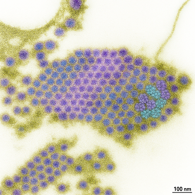 Figure 1. Chikungunya virus particles observed under high-resolution electron microscopy. High-resolution scanning electron micrograph illustrating multiple Chikungunya virus (CHIKV) particles. Each virion exhibits its characteristic spherical morphology, with a dense central nucleocapsid surrounded by a lipid envelope that contains surface glycoprotein spikes involved in host-cell attachment and entry. This structural organization underlies viral infectivity and facilitates transmission by Aedes mosquitoes.Figure generated by the authors using a custom AI-assisted workflow and validated against current structural virology literature.