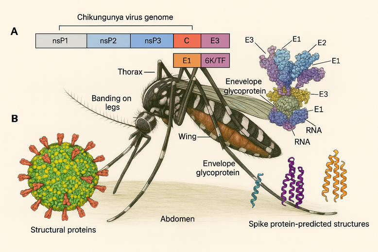 Panel A: Schematic representation of the Chikungunya virus (CHIKV) genome, which encodes four nonstructural proteins (nsP1–nsP4) responsible for viral replication, and the structural proteins capsid (C), envelope glycoproteins (E1–E3), and 6K/TF, which are essential for virion assembly, budding, and host-cell entry.