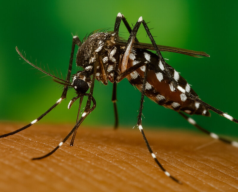 High-resolution image of Aedes albopictus (the Asian tiger mosquito), a major vector of Chikungunya, Dengue, and Zika viruses. The species is characterized by distinctive black-and-white leg banding and a single white dorsal thoracic stripe. A. albopictus exhibits aggressive daytime biting behavior and high ecological adaptability, allowing it to thrive in both urban and peri-urban environments. Its expanding geographic range in the Americas has increased the risk of Chikungunya transmission, particularly in densely populated areas with favorable breeding sites.