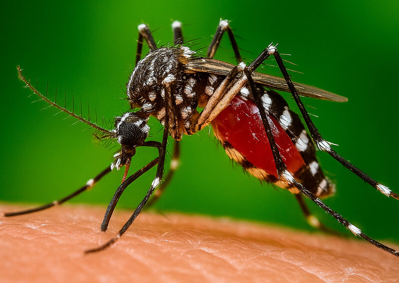 High-resolution image of Aedes aegypti, the primary urban vector for Chikungunya, Dengue, Zika, and yellow fever viruses. This species is identifiable by its lyre-shaped white dorsal markings on the thorax, banded legs, and its preference for feeding on humans (anthropophilic behavior). A. aegypti thrives in densely populated urban environments, breeds in artificial water containers, and exhibits peak biting activity during daylight hours. Its strong human–mosquito–human transmission cycle and high vector competence make it the dominant driver of Chikungunya outbreaks in Latin America.