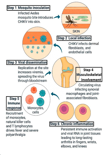 Schematic representation of the pathogenesis of Chikungunya virus (CHIKV) infection. Following inoculation of the virus into the skin by an infected Aedes mosquito (step 1), CHIKV initially infects dermal fibroblasts, macrophages, and endothelial cells (step 2). Viral replication at the inoculation site leads to increasing viremia and dissemination through the bloodstream (step 3). Circulating virus subsequently infects musculoskeletal tissues, including synovial macrophages and joint-associated fibroblasts (step 4), triggering a robust innate and adaptive immune response. Recruitment of inflammatory cells—such as monocytes, natural killer cells, and T lymphocytes—into infected tissues (step 5) contributes to the acute febrile phase and severe polyarthralgia. Persistent immune activation and viral RNA persistence in joint tissues may lead to chronic inflammation and long-lasting arthritis that can affect fingers, wrists, elbows, and knees (step 6).