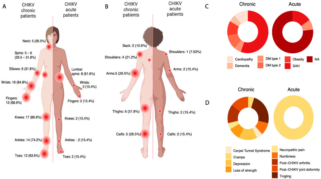 Figure 6. Anatomical distribution of pain, comorbidities, and symptom profiles in acute and chronic Chikungunya virus (CHIKV) infection.