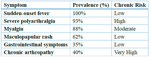 CHIKV infection typically manifests with sudden-onset high fever, severe polyarthralgia, myalgia, headache, and a maculopapular rash. Gastrointestinal symptoms (nausea, vomiting, diarrhea) and ocular manifestations (conjunctivitis) have been reported in a subset of patients. While most infections are self-limited, chronic post-viral arthropathy affects up to 40% of patients, persisting for months or years and causing significant functional impairment, decreased quality of life, and economic losses due to reduced productivity. Recent authors strongly support this burden, documenting that chronic joint pain affects a significant proportion of patients and can lead to long-term disability and socioeconomic burden. Comorbidities such as diabetes, hypertension, and pre-existing joint disorders increase the risk of severe arthropathy and prolonged recovery. Older adults and immunocompromised individuals are particularly susceptible to severe manifestations, including neurological complications and chronic fatigue. 30
