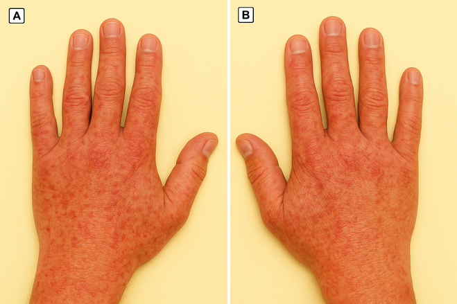 Figure 8. Cutaneous and periarticular manifestations during acute Chikungunya virus infection. Panel A: Dorsal view of the left hand showing an intense erythematous maculopapular rash accompanied by periarticular swelling, consistent with acute-phase Chikungunya virus (CHIKV) infection. The combination of diffuse rash and early inflammatory edema around the metacarpophalangeal and interphalangeal joints reflects the characteristic viral-induced synovitis and soft-tissue inflammation.