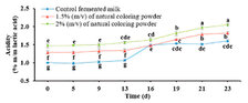 Influence of a natural colorant powder from Syzygium cumini L. (Skeels) on sensory and physicochemical properties during storage of a heat-treated flavored fermented milk