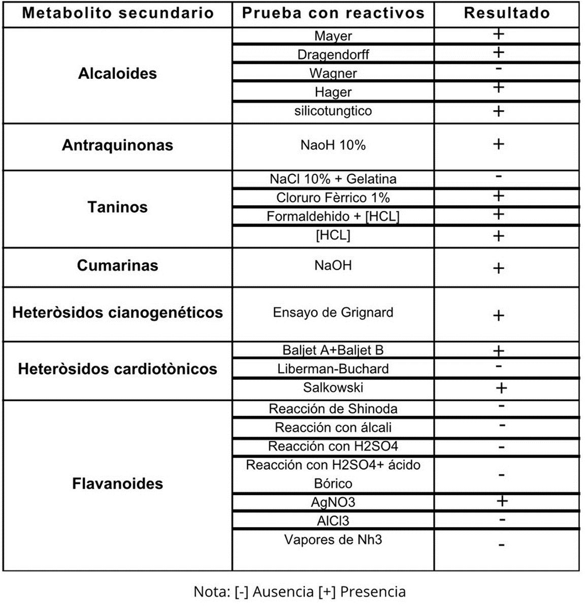 Se identificó la presencia de alcaloides, antraquinonas, taninos, cumarinas y heterósidos cianogenéticos. Sin embargo, las pruebas para flavonoides y heterósidos cardiotónicos no fueron concluyentes.
