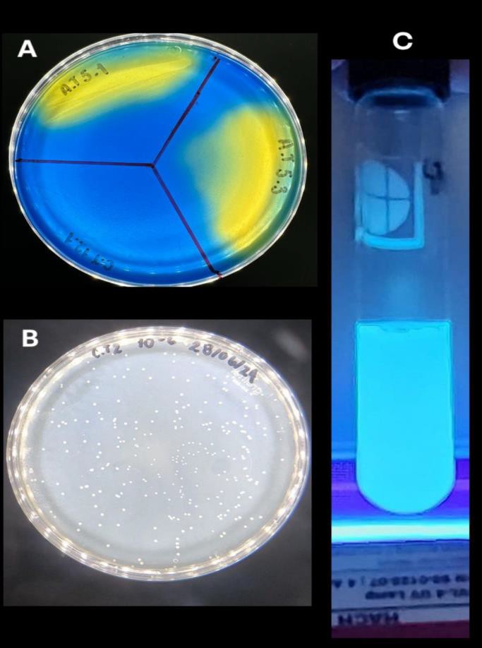 Figura 2. Imagen A). Colonias bacterianas en agar Aleksandrov. Imagen B) Colonias bacterianas en agar Ashby. Imagen C) Fluorescencia observada en cultivo bacterianos en Caldo Nutritivo