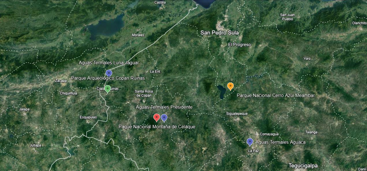 Figura 1. Localización de los sitios de muestreo. El indicador rojo muestra la localización del Parque Nacional Montaña del Celaque, el indicador amarillo presenta la localización del Parque Nacional Cerro Azul Meambar (PANACAM), el localizador verde el Parque Arqueológico Copan Ruinas y el localizador violeta indica la localización del parque Aguas termales Luna Jaguar, Aguas termales presidente y Aguas termales Aguaca