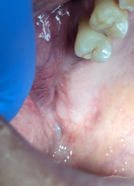 Paciente masculino de 58 años originario de Nacaome, Valle, se presentó en la Clínica de Emergencias de la Facultad de Odontología de la Universidad Nacional Autónoma de Honduras refiriendo 'presión en los dientes' e inflamación posterior a una extracción dental. El paciente indicó ser hipertenso y negó antecedentes alérgicos u hospitalarios. En la exploración extraoral, se determinó la presencia de inflamación crónica en el lado derecho de la cara, dolor irradiado en una escala numérica de tres [3], otitis, edema y adormecimiento facial en la zona.