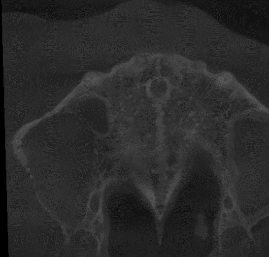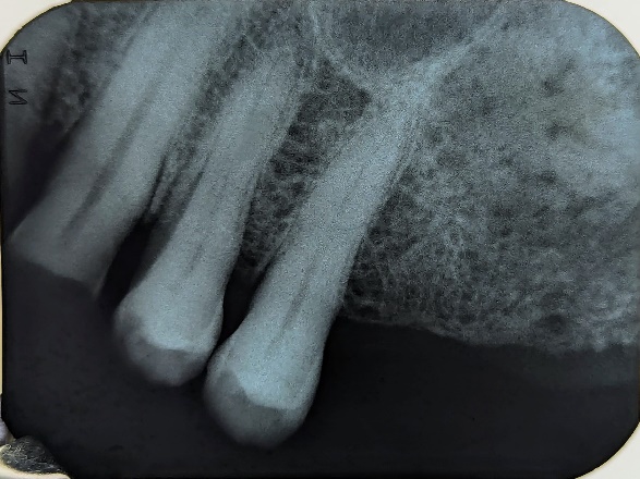 En la evaluación intraoral, se observó que el tejido blando del cuadrante uno presentaba una lesión de tipo inflamatoria de color grisácea-violácea vascularizada. Se realizaron radiografías periapicales de la zona en las cuales se observó un área mixta multiloculada, trabeculado óseo de forma irregular y con posible relación a la cortical del seno maxilar (Figura 1). Se solicitó Tomografía Computarizada de Haz Cónico (TCHC) y se realizó una biopsia incisional de la zona, abarcando un área de 1.5 x 1.5 cm.