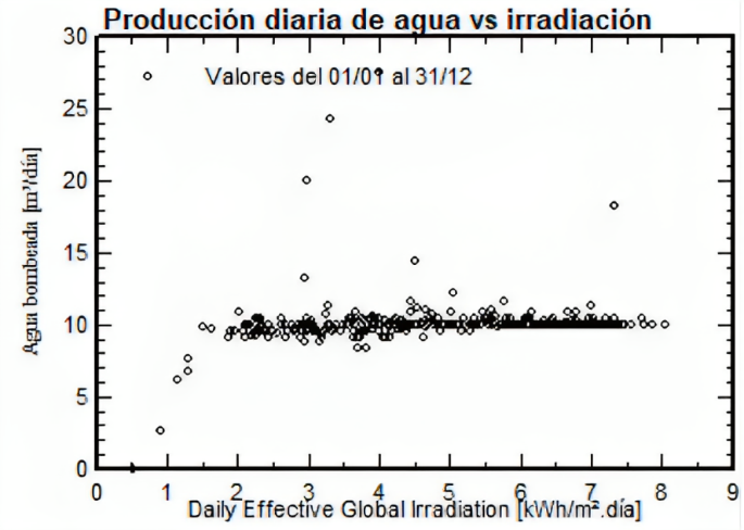 En las 17 comunidades se determinó la producción de agua de sistemas de riego alimentado con bombeo solar, presentan una curva de producción de agua diaria versus la irradiación solar efectiva (HSP), requiriendo para satisfacer la necesidad de agua un caudal de 10 m3/h los cuales se alcanzan después de 2 horas efectivas de radiación, con lo cual el sistema a después de las 8 de la mañana trabaja en optima condiciones y satisface la necesidad de agua a los cultivos (Fig. 1).