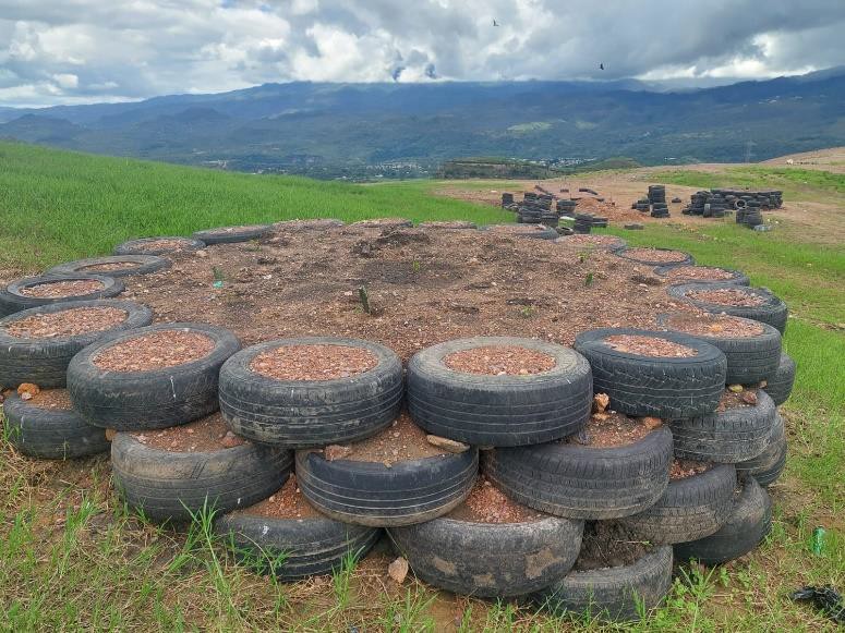 Imagen 1 y 2 Utilización de llantas en la construcción de jardineras elevadas y senderos en relleno sanitario del Distrito Central.