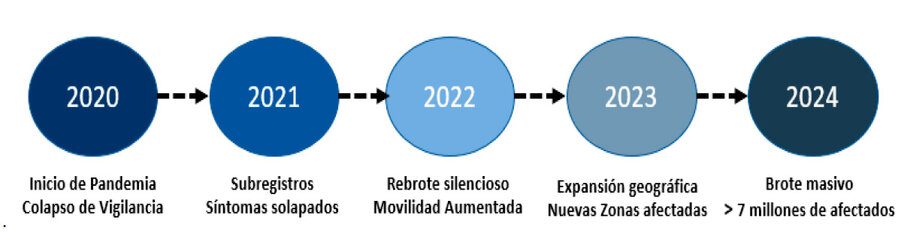 Figura 1. Línea de tiempo (2020–2024) con los principales cambios epidemiológicos y determinantes. La figura muestra la evolución del dengue en América Latina entre 2020 y 2024, destacando las etapas de inicio de la pandemia, subregistro, rebrote silencioso, expansión geográfica y el brote masivo con más de siete millones de casos.