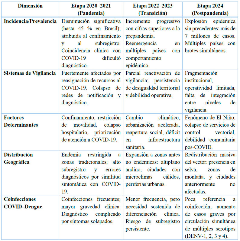 El comportamiento epidemiológico del dengue en América Latina entre 2020 y 2024 revela un proceso dinámico y complejo, marcado por cambios en su perfil clínico, territorial y estructural, condicionados por factores sociales, ecológicos, sanitarios y políticos (Tabla 1). Para comprender esta evolución resulta útil organizar el análisis en siete dimensiones clave: 1- comparación entre etapas pandémica, transición y postpandémica; 2- relación causal entre determinantes estructurales y la epidemiología; 3- evaluación crítica de sistemas de vigilancia; 4- análisis de resiliencia institucional; 5- valoración de la calidad de la evidencia científica revisada; 6- perspectiva de salud global; y 7- proyección de escenarios futuros y recomendaciones.