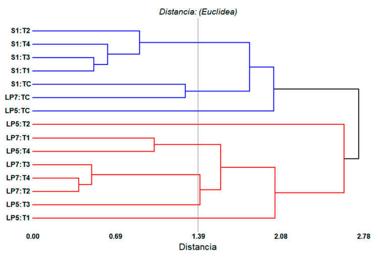 Figure 6. Cluster analysis between the variables biostimulated with the application of pyroleanic acid obtained from marabú (Dichrostachys cinerea).