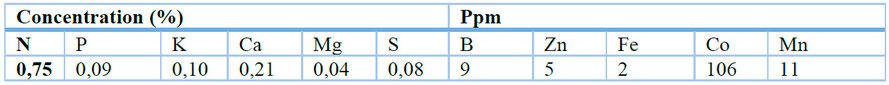 Table 1. Chemical composition of pyroligneous acid derived from marabou wood (Dichrostachys cinerea). The table presents the macronutrient and micronutrient content expressed in parts per million (ppm), except for the total solution concentration (0.75%). The elements measured include: N (nitrogen), P (phosphorus), K (potassium), Ca (calcium), Mg (magnesium), S (sulfur), B (boron), Zn (zinc), Fe (iron), Co (cobalt), and Mn (manganese). The absence of a value for manganese (Mn) indicates it was not detected or not reported in the analysis.