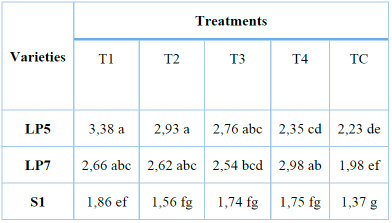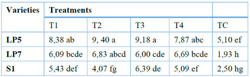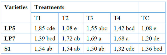 The plant height variable showed significant differences between treatments in the cultivars used. The highest results were obtained with the application of treatments T1 and T2 on cultivar LP5; however, the interactions with cultivar Selection 1 showed the lowest biostimulation. These results could reveal the efficacy of the bioproduct on cultivar development.