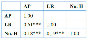 Figure 4. Spearman correlation heatmap among plant height (AP), radicle length (RL), and number of leaves (No. H) in rice seedlings biostimulated with pyroligneous acid under controlled conditions. Coefficients are shown within cells; all reported associations were positive, with a strong correlation between AP and RL (ρ = 0.61) and weaker correlations involving No. H (ρ = 0.18–0.19). All coefficients were significant in the original analysis (***, p < 0.001).