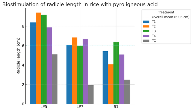 Figure 2. Effect of pyroligneous acid obtained from marabou wood (Dichrostachys cinerea) on radicle length of three rice (Oryza sativa L.) varieties (LP5, LP7, and S1) under controlled conditions. Values represent means of 10 replicates per treatment. Treatments: T1 = 1 mL·L⁻¹, T2 = 2 mL·L⁻¹, T3 = 3 mL·L⁻¹, T4 = 4 mL·L⁻¹, TC = control (no pyroligneous acid). The dashed red line indicates the overall mean radicle length across all treatments and varieties. Error bars indicate standard deviation. Different letters above the bars denote statistically significant differences according to the Kruskal–Wallis test (p < 0.05).