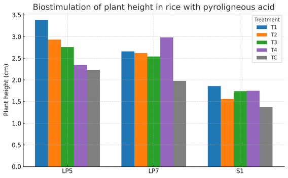Figure 1. Effect of pyroligneous acid obtained from marabou wood (Dichrostachys cinerea) on plant height of three rice (Oryza sativa L.) varieties (LP5, LP7, and S1) under controlled conditions. Values represent means of 10 replicates per treatment. Treatments: T1 = 1 mL·L⁻¹, T2 = 2 mL·L⁻¹, T3 = 3 mL·L⁻¹, T4 = 4 mL·L⁻¹, TC = control (no pyroligneous acid). Error bars indicate standard deviation. Different letters above the bars denote statistically significant differences according to the Kruskal–Wallis test (p < 0.05).