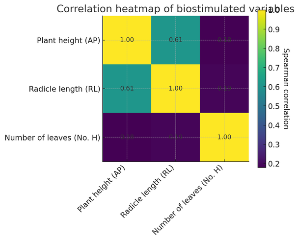 - Radicle length exhibited the strongest positive correlation with plant height (ρ = 0.61), highlighting the central role of root system development in promoting above-ground biomass accumulation.