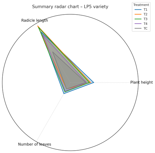 The radar chart (Figure 5) for LP5 integrates these results, highlighting T1 and T2 as balanced treatments that enhance all three traits simultaneously, while higher doses improved some parameters but not all. This reinforces the concept of dose optimization to maximize multiple growth indicators.