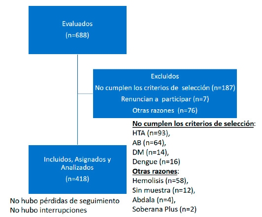Se recolectaron muestras de sangre total y suero mediante punción venosa a los 418 participantes. (Figura 1)
