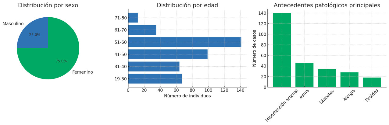 En la población estudiada predominó el sexo femenino, el color de piel blanca y el rango de edad entre 51 y 60 años. Los antecedentes patológicos personales más frecuentes fueron la hipertensión arterial, el asma bronquial, la diabetes mellitus, las alergias y las enfermedades de la glándula tiroidea. Estos hallazgos aportan un perfil clínico y sociodemográfico de referencia para futuros estudios en personal sanitario.