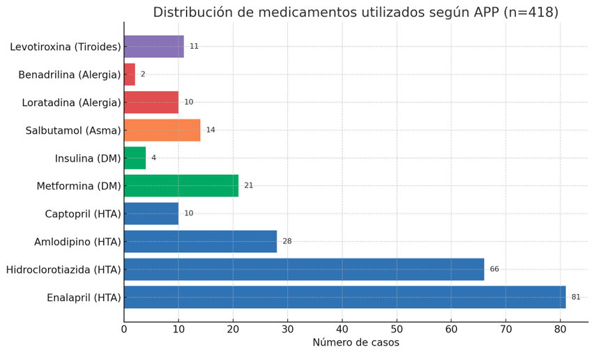 En la Figura 3 se presenta la distribución de la ingestión de medicamentos según APP. La ingestión de medicamentos más frecuentes se corresponde igualmente con los APP más frecuentes de la población de estudio. Para la HTA la enalapril 19.1%, hidroclorotiazida 11,1%, amlodipino 6,6% y captopril 2.6%, para el asma bronquial el salbutamol 4%, para la diabetes mellitus la metformina 4.7% y la insulina 0,9%, para la alergia la benadrilina 0.5% y la loratadina 2.6%, y para la enfermedad tiroidea la levotiroxina sódica 2.6%.